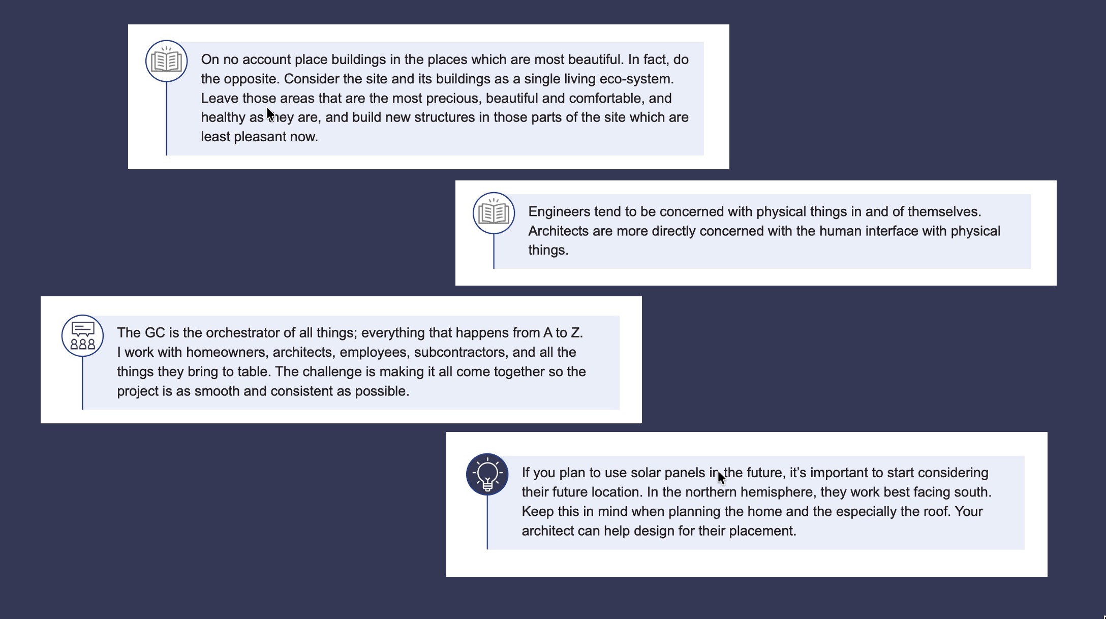 The Custom Home Navigator book is like an operating manual for being a homeowner. It will help them see the big picture and how to be productive during the project.